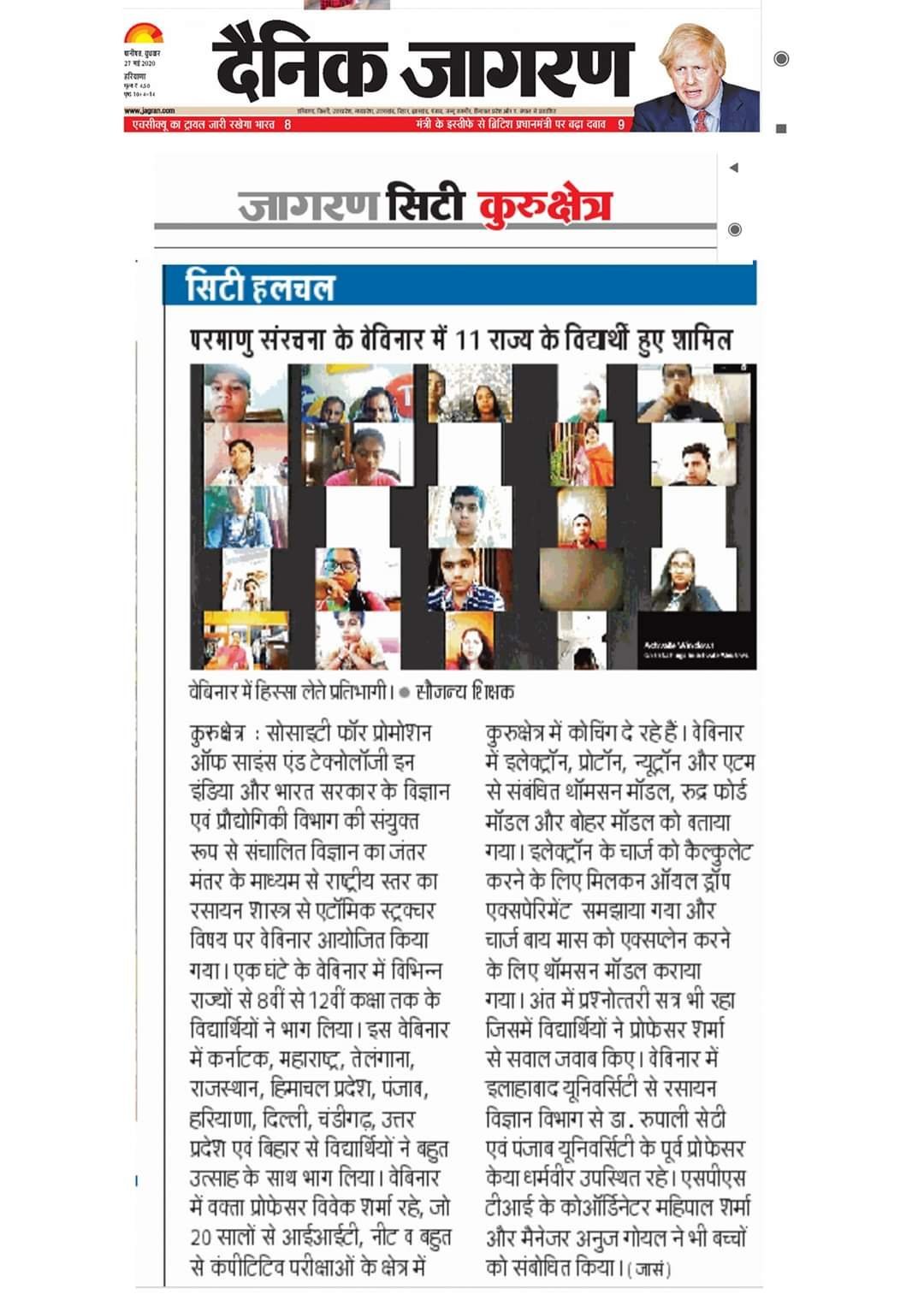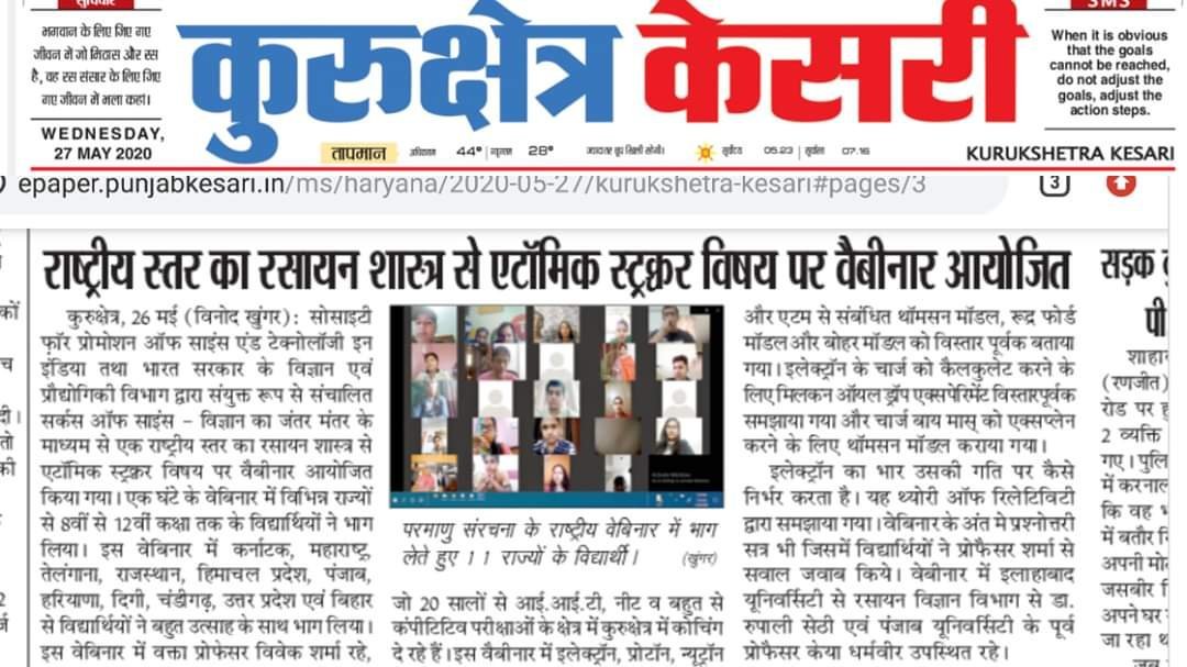 वेबिनार में वक्ता प्रोफेसर विवेक शर्मा रहे जो 20 सालों से आई.आई.टी, नीट व बहुत से कंपीटिटिव परीक्षाओं के फील्ड में कुरुक्षेत्र में कोचिंग दे रहे हैं। इस वेबिनार में इलेक्ट्रॉन, प्रोटॉन, न्यूट्रॉन और एटम से संबंधित थॉमसन मॉडल, रूद्र फोर्ड मॉडल, और बोहर मॉडल को विस्तार पूर्वक बताया गया। इलेक्ट्रॉन के चार्ज को कैलकुलेट करने के लिए मिलकन ऑयल ड्रॉप एक्सपेरिमेंट विस्तारपूर्वक समझाया गया और चार्ज बाय मास् को एक्सप्लेन करने के लिए थॉमसन मॉडल कराया गया। इलेक्ट्रॉन का भार उसकी गति पर कैसे निर्भर करता है यह थ्योरी ऑफ रिलेटिविटी द्वारा समझाया गया। वेबिनार के अंत मे प्रश्नोत्तरी सत्र भी जिसमे छात्रों ने प्रोफेसर शर्मा से सवाल जवाब किये।