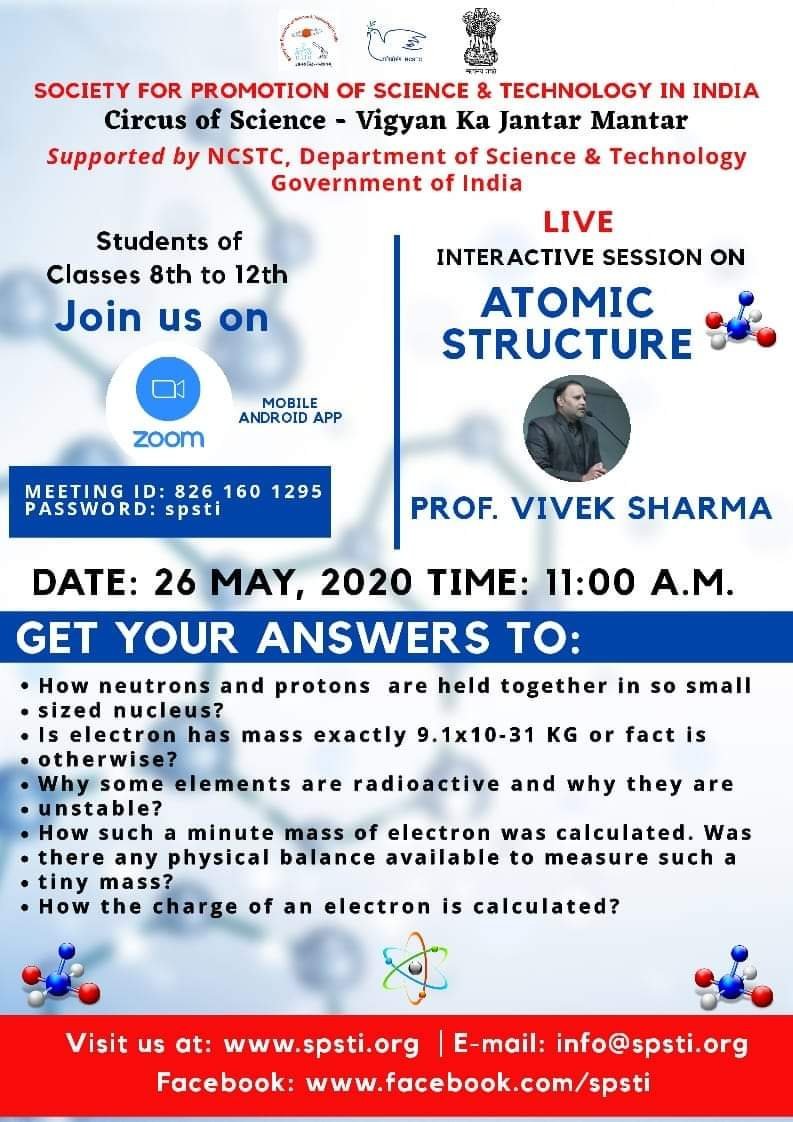 सोसाइटी फ़ॉर प्रोमोशन ऑफ साइंस एंड टेक्नोलॉजी इन इंडिया एवम भारत सरकार के विज्ञान एवं प्रौद्योगिकी विभाग द्वारा संयुक्त रूप से संचालित सर्कस ऑफ साइंस – विज्ञान का जंतर मंतर के द्वारा एक राष्ट्रीय स्तर का वेबिनार आयोजित किया गया जिसका विषय रसायन शास्त्र से एटॉमिक स्ट्रक्चर रहा।