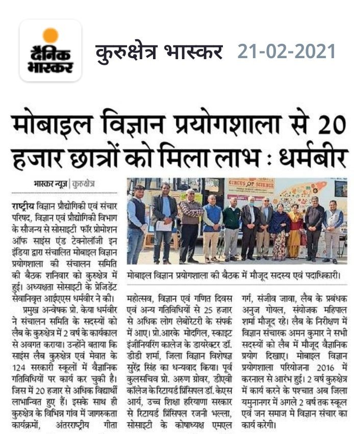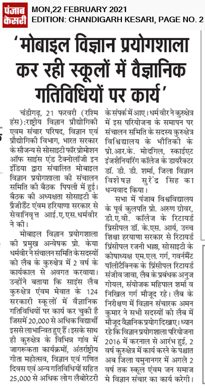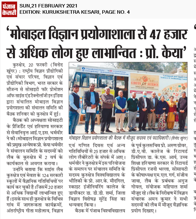 राष्ट्रीय विज्ञान प्रौद्योगिकी एवम संचार परिषद, विज्ञान एवं प्रौद्योगिकी विभाग, भारत सरकार के सौजन्य से सोसाइटी फ़ॉर प्रोमोशन ऑफ साइंस एंड टेक्नोलॉजी इन इंडिया द्वारा संचालित मोबाइल विज्ञान प्रयोगशाला की संचालन समिति की बैठक शनिवार को पिपली में हुई। बैठक की अध्यक्षता सोसाइटी के प्रेजिडेंट एवम हरियाणा सरकार से सेवानिवृत्त आई.ए.एस. श्री धर्मवीर ने की। मोबाइल विज्ञान प्रयोगशाला की प्रमुख अन्वेषक प्रो. केया धर्मवीर ने संचालन समिति के सदस्यों को लैब के कुरुक्षेत्र में 2 वर्ष के कार्यकाल से अवगत कराया। उन्होंने बताया कि साइंस लैब कुरुक्षेत्र एवम मेवात के 124 सरकारी स्कूलों में वैज्ञानिक गतिविधियों पर कार्य कर चुकी है जिसमे 20,000 से अधिक विद्यार्थी इससे लाभान्वित हुए हैं। इसके साथ ही कुरुक्षेत्र के विभिन्न गांव में जागरूकता कार्यक्रमों, अंतरराष्ट्रीय गीता महोत्सव, विज्ञान एवं गणित दिवस एवं अन्य गतिविधियों समेत 25,000 से अधिक लोग लेबोरेटरी के सम्पर्क में आये। श्री धर्मवीर ने कुरुक्षेत्र में इस परियोजना के समापन पर संचालन समिति के सदयस कुरुक्षेत्र विश्विद्यालय के भौतिकी के प्रो.आर.के. मोदगिल, स्काईएट इंजीनियरिंग कॉलेज के डायरेक्टर डॉ. डी. डी. शर्मा, जिला विज्ञान विशेषज्ञ श्री सुरेंदर सिंह का धन्यवाद किया।