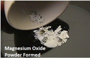 4. Formation of Magnesium Oxide: After the magnesium ribbon has burnt, a white substance is formed in powdered form, called magnesium oxide. The reaction follows: