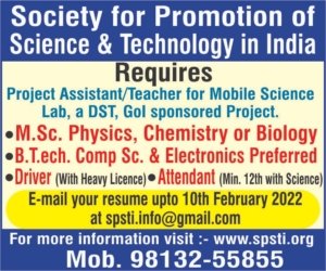 We, at SPSTI recruit passionate and committed personnel who can reach out to the people to make a difference. The Society hires enthusiastic students from Sciences/ Engineering/Management/Diploma/ITI with or without experience in our science outreach projects. Join us to nurture your skills in science and technology for sustainable living and contribute to the noble cause and the mission of our Society – Taking Science to the People.