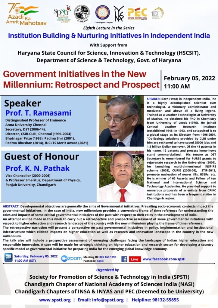 The Society for Promotion of Science & Technology in India (SPSTI), in association with Chandigarh Chapter of the National Academy of Sciences India (NASI) and Chandigarh chapters of INSA & INYAS and Punjab Engineering College (PEC) (Deemed to be University), Chandigarh and with support from Haryana State Council for Science, Innovation & Technology (HSCSIT), DST, Govt. of Haryana, organised the eighth lecture of the Eighteen part Lecture series devoted to ‘Institution Building & Nurturing Initiative in Independent India’ to celebrate Azadi ka Amrut Mahotsava. The lecture entitled “Government Initiatives in the New Millenium: Retrospect and Prospect” was delivered by Padma Bhushan Prof. T. Ramasami, former Secretary, DST, Govt. of India on February 05, 2022 at 11.00 am through online mode. The session was attended on zoom platform by 65 and many more viewed the same on the Facebook page of SPSTI.