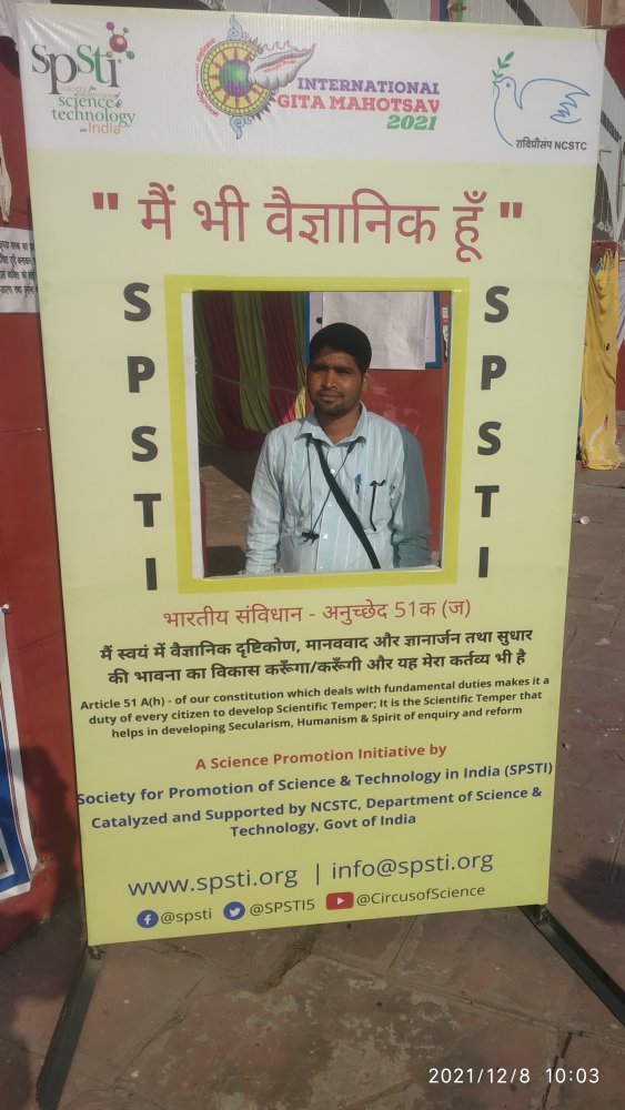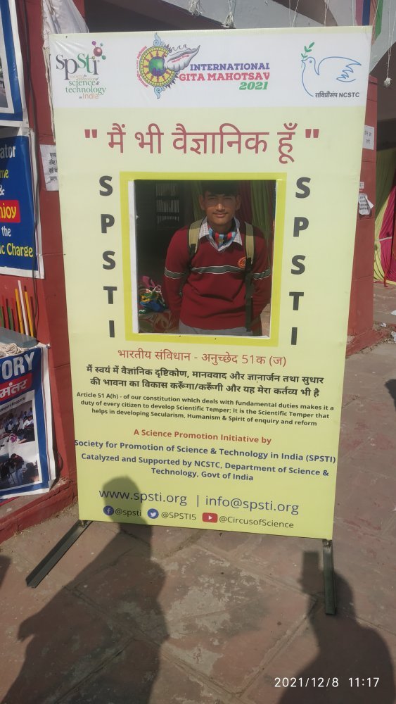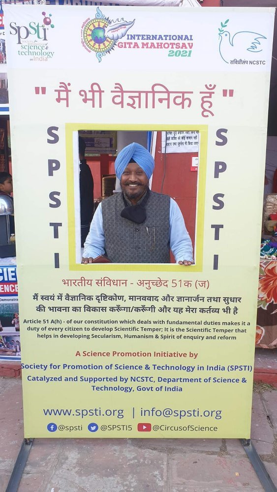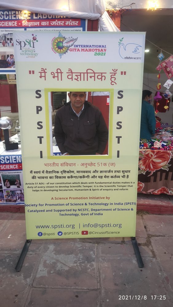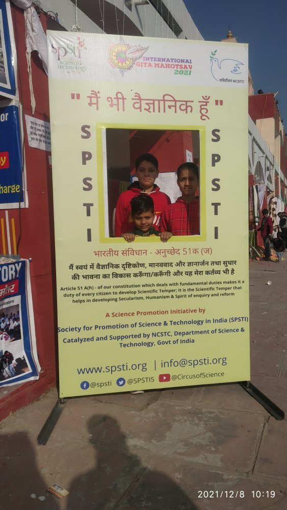 In the famous International Gita Mahotsav – 2021, which is organized by the Govt. of Haryana every year at the Asia’s largest man-made pond, Brahma Sarovar, SPSTI conducted a science exhibition for the general public. The initiative to aware the people about this was to make them learn about this and motivating them to adopt scientific practices in their daily life. A selfie-stand was installed to engage them in this activity which could help them later to remind about this duty. A large number of people participated in this unique activity. Some glimpses are attached.