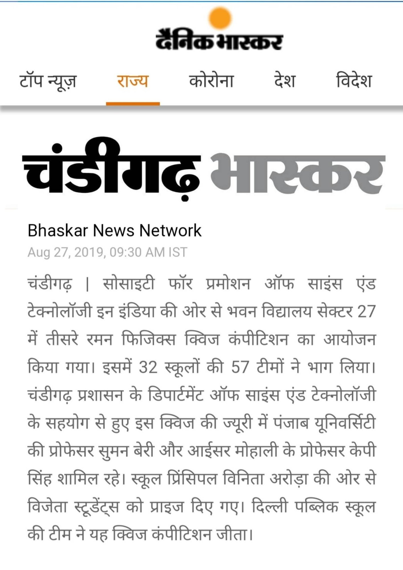 The team consisting of the duo Aditya Prasad and Hirdal Singh, of Delhi Public School, Chandigarh won the Third Raman Physics Quiz organized for schools of Chandigarh by the Society for Promotion of Science & Technology in India today at the Bhavan Vidyalaya, Sector-27B, Chandigarh. Two teams, namely Nikhil Goyal and Hargun Singh Walia, students of Bhavan Vidyalaya and Jaisidh Singh and Sachin Singh of Sri Guru Gobind Singh Collegiate shared the second position. Pranshu and Bhavya Kohli of Pt. Mohan Lal SD Public School got the third position.